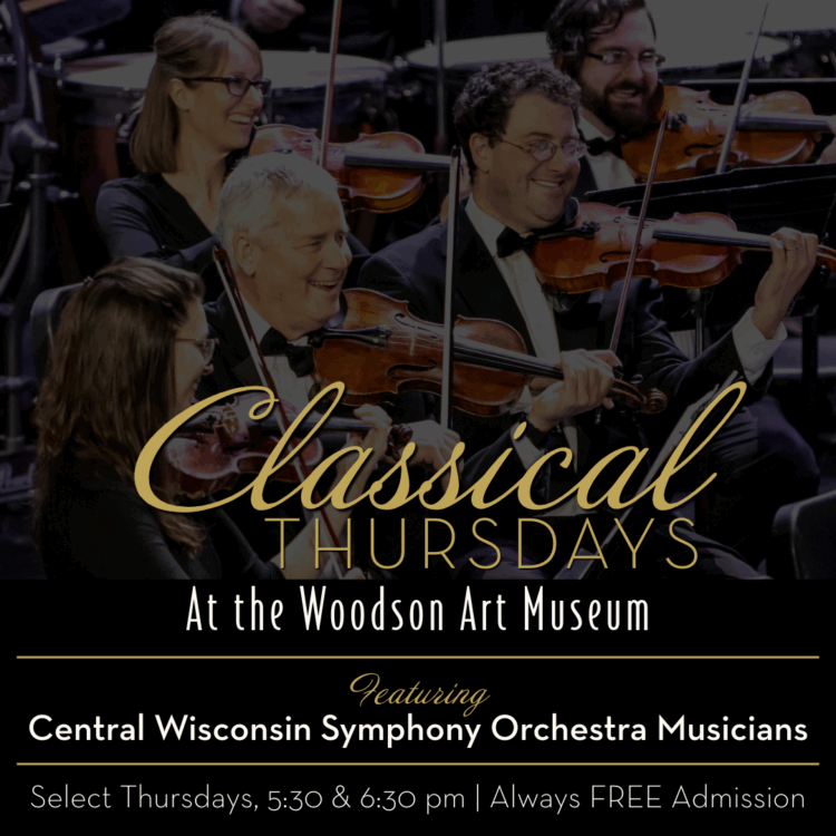 Central Wisconsin Symphony Orchestra musicians provide classical music to enhance the in-gallery experience. Please join us at 5:30 & 6:30 pm to enjoy artwork in the galleries and beautiful music provided by the Central Wisconsin Symphony Orchestra. These programs are FREE to attend. Performing musician: Ann Applegate (piano)